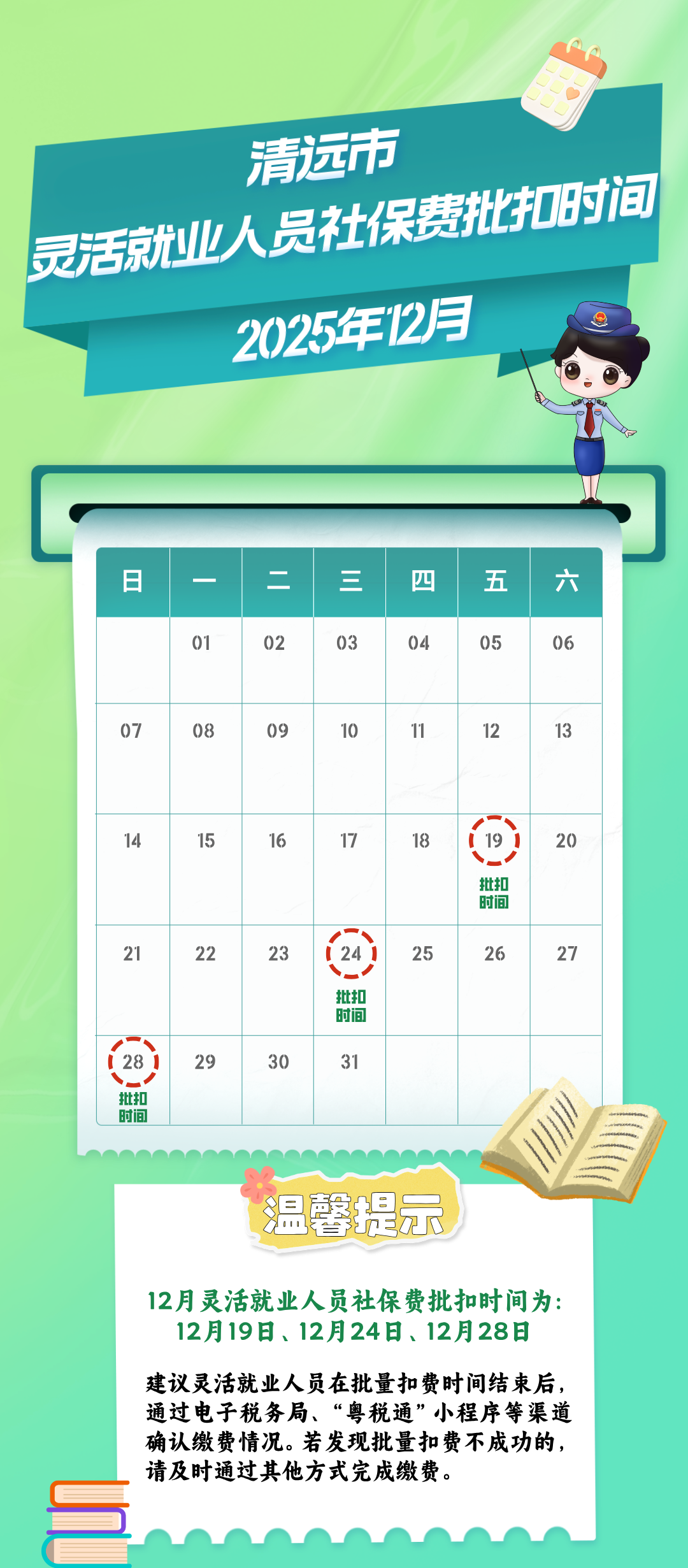 导致扣款失败常见的原因有余额不足、扣款账户状态异常等。若余额不足,请在本月下次批扣前在扣款账户内足额存入应扣费款;若扣款账户状态异常,请联系银行处理,将扣款账户恢复至可正常扣款状态。缴费人可等待税务机关再次发起批扣,或者自行通过线上渠道进行清缴,建议您优先通过“粤税通”小程序进行办理。灵活就业人员社保费“粤税通”小程序自行清缴路径:登录“粤税通”小程序,右上角选择“个人业务”,进入【我的社保】-【灵活就业人员社保】-【清缴社保费】模块即可清缴。