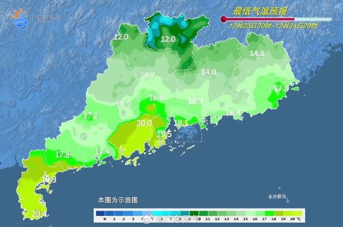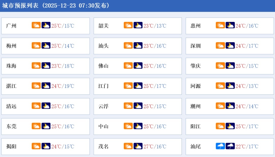 23日,粤北、粤东和珠江三角洲市县多云到阴天,有小雨或零星小雨,其余市县多云,局部有零星小雨。最低气温:韶关、清远北部、肇庆北部、河源北部、梅州北部市县11~14℃,珠三角南部和粤西沿海市县17~21℃,其余市县15~17℃。